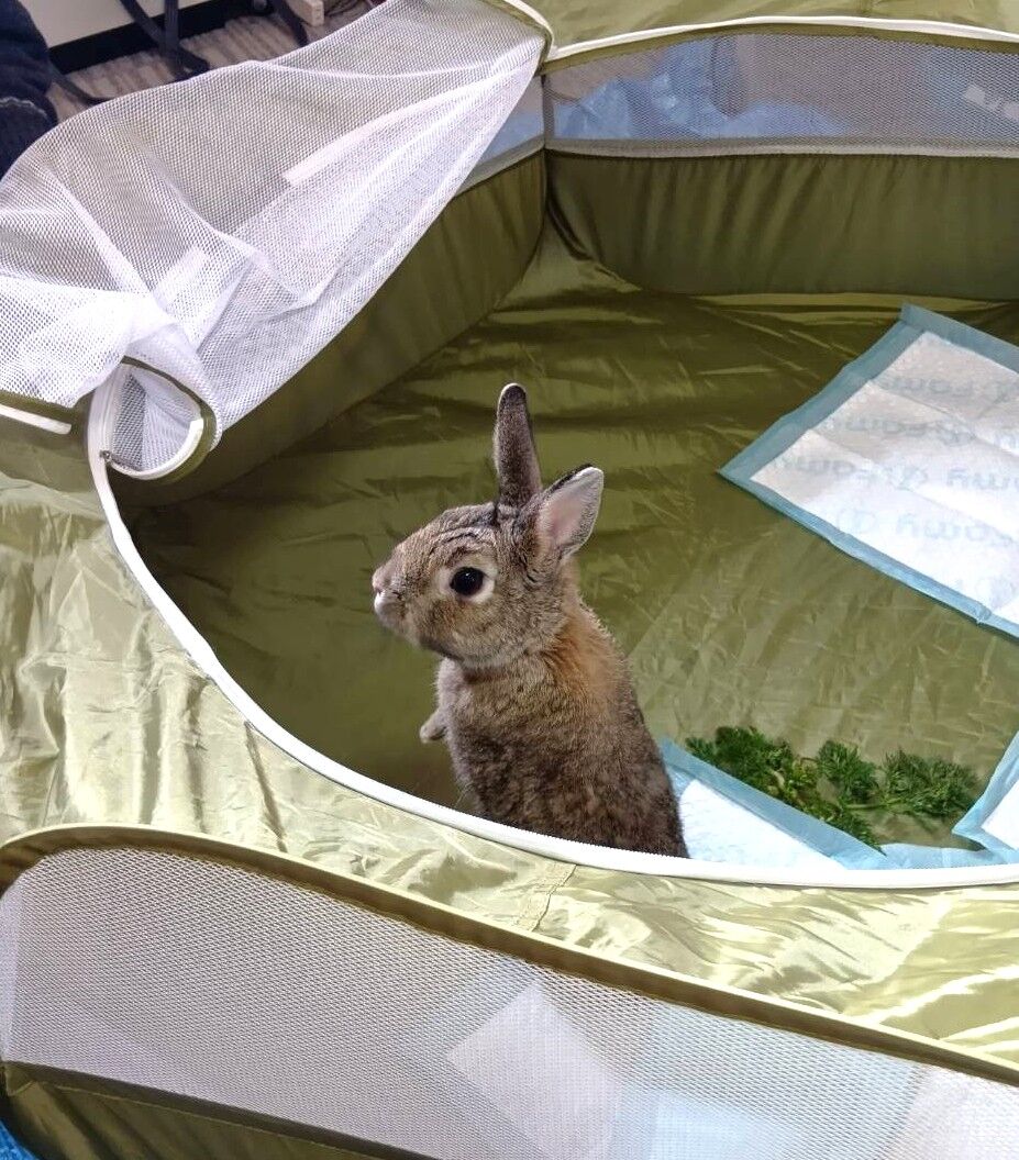 到着後は元気いっぱいで、ケージの準備中にキャリーの中でおしっこをする場面もありましたが、その後は走り回って過ごしていました。