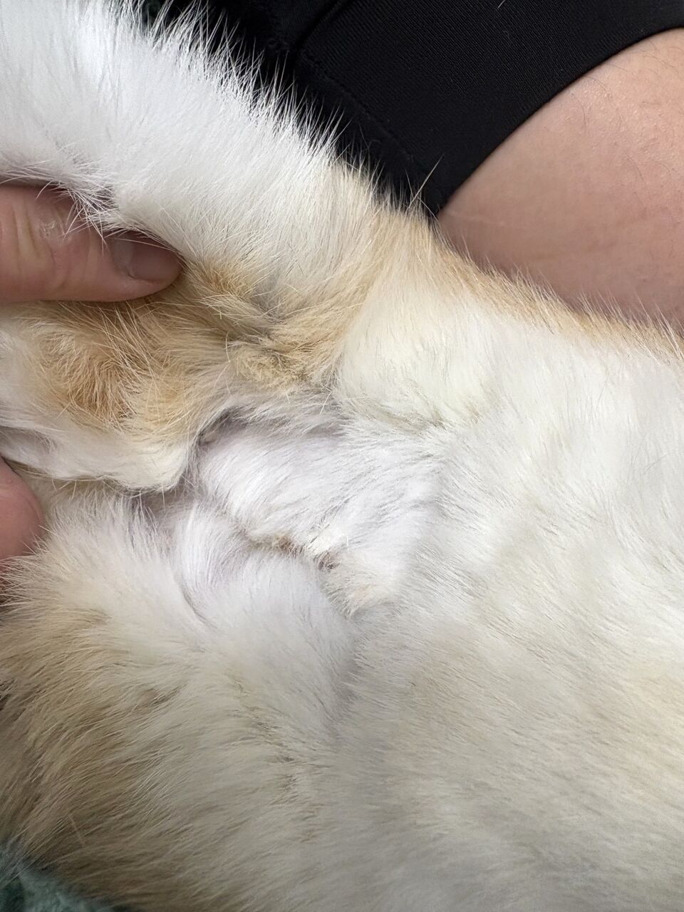 尻尾に皮膚炎があり、前足の付け根や後ろ足の内側にも同様の所見を確認されました。