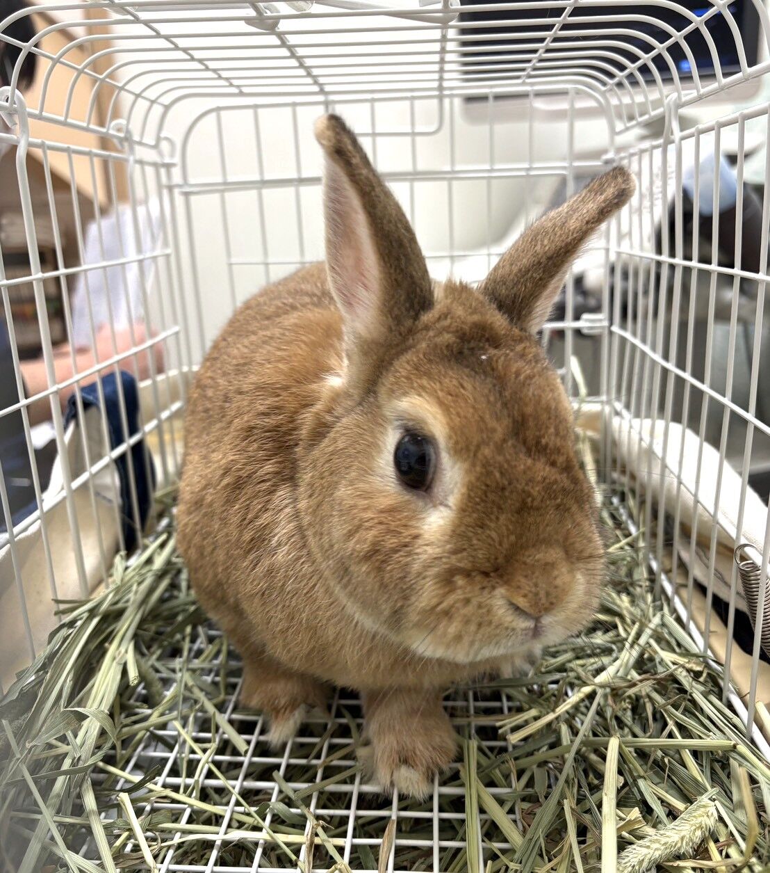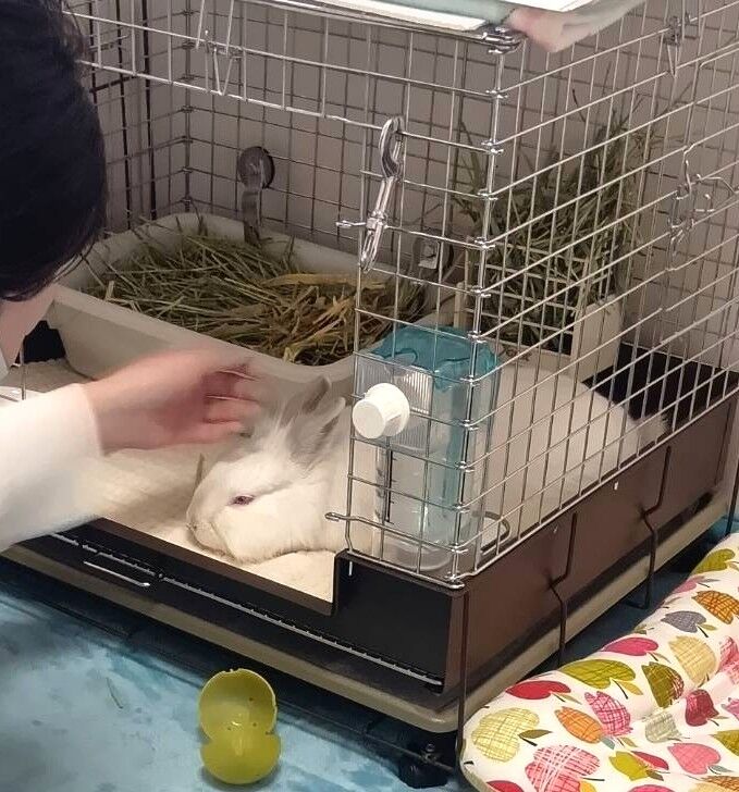 ケージに入るとすぐにチモシーを食べ始め、落ち着いた様子を見せてくれました。