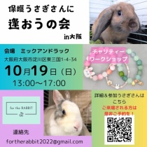毎月恒例の『保護うさぎさんに逢おうの会in大阪』11月9日開催のご案内です。今回も、毎月会場をご提供くださっているうさぎ専門店 Mick and Luckさんにて開催します。11月は、11/3京都、11/9大阪、11/23梅っこ日和(摂津市 予約不要)の3会場で譲渡会を予定しています。ご縁を ...
